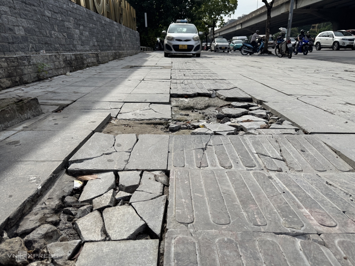 Sau thời gian sử dụng, nhiều vỉa hè xuất hiện tình trạng lún nứt, vỡ. Tại nút giao Đinh Tiên Hoàng – Hàng Bài, phường Hoàng Kiếm, đoạn lún sâu 10 cm, gạch bong tróc.